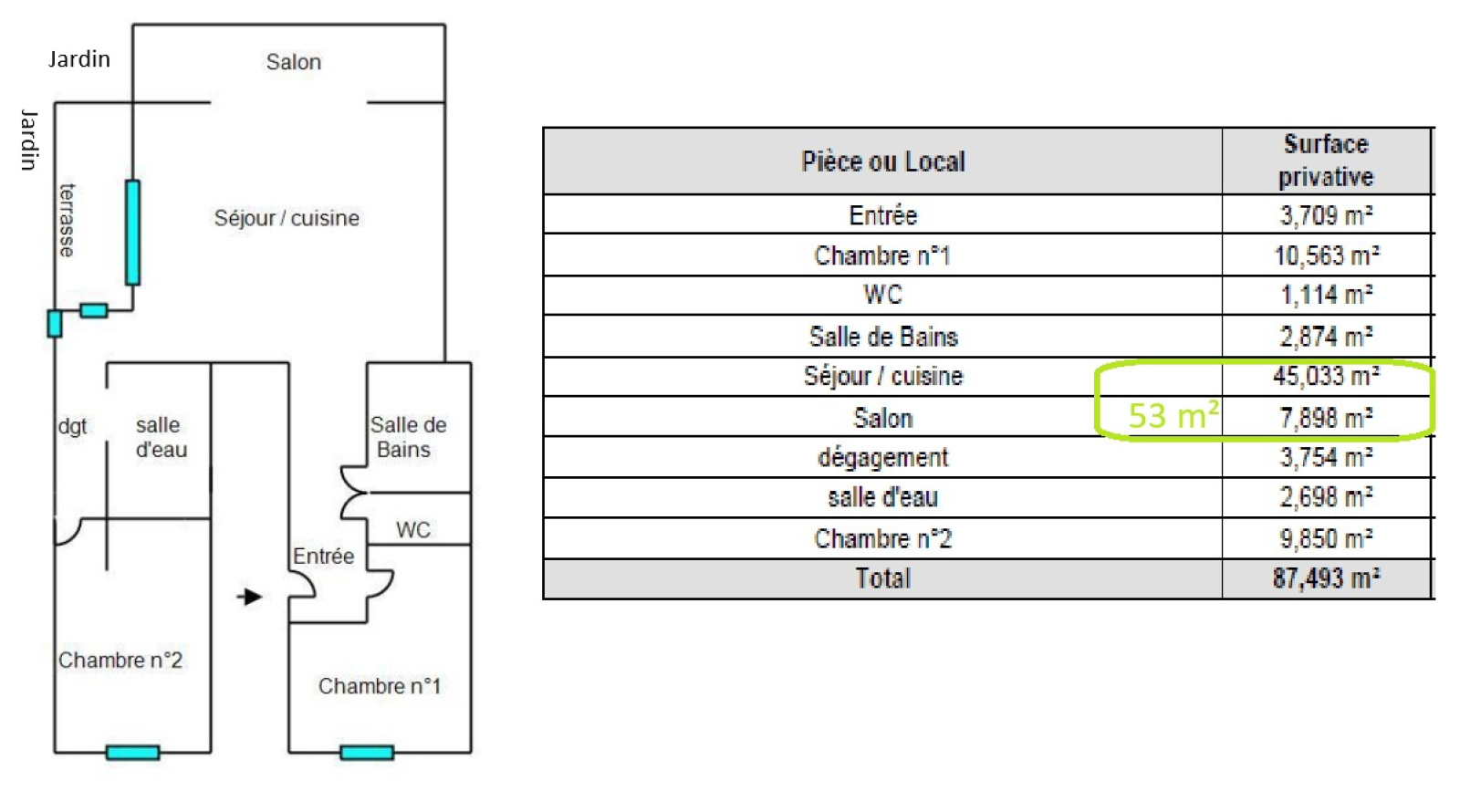 - Belle et vaste pièce de vie de 53 m² environ